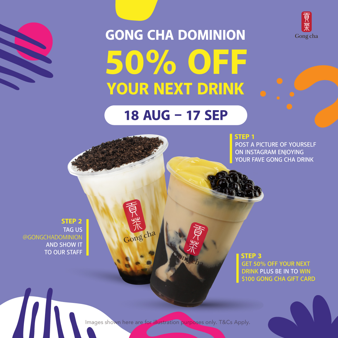 - Validity: The "50% off your next drink if you post a picture of yourself with a Gong cha drink and tag @GongchaDominion" promotion ("Promotion") is only valid from 18th August 2023 and 17th September 2023 for a duration of 1 month.